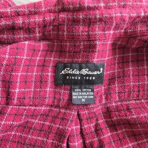 Wrap yourself in the comfort of Eddie Bauer's classic red flannel shirt, a staple for any wardrobe that appreciates a touch of vintage charm. This medium-sized, long-sleeve button-up offers a collared neckline and a regular fit, perfect for casual outings, travel, or even a smart-casual work environment.