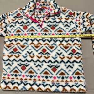 Eddie Bauer 1/4 Zip Pullover Fleece Aztec Print So Soft Size L This is the softest thing I’ve ever felt! Beautiful colorful Aztec print Like new condition