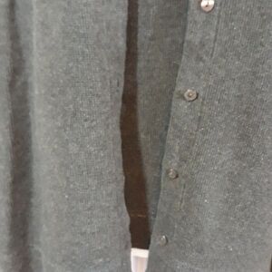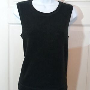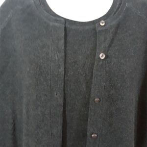 This is a fantastic set by Eddie Bauer made from 99% cotton and 1% spandex. Has a sleeveless top with round neckline that can be worn by itself and if you should get chilly it has the same material and color with long and sleeves that you can wear open or button up. The color is charcoal grey almost black. I Love this !! Excellent condition!! Size med. Measurements are approximately lying flat pit to pit top 18" open top 19" buttoned.