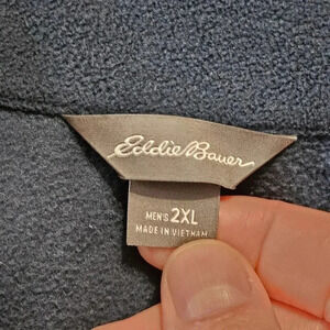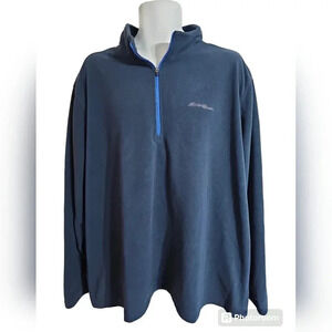 Eddie Bauer men's 2XL fleece pullover in classic navy blue. Features a 1/4 zip mock neck with contrast zipper detail and embroidered logo at the chest. Perfect for layering, hiking, or casual weekend wear. Soft, warm, and comfortable for cooler weather.