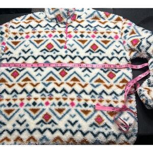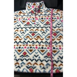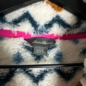 Aztec style print 1/4 zip Sherpa pullover from Eddie Bauer. Women’s size L. See photos for measurements. Gently preowned condition with no tears or stains.