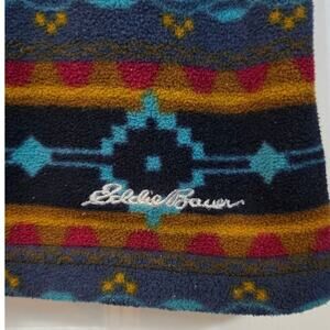 Eddie Bauer women’s quarter-zip fleece pullover in size Large. Features a bold Southwestern/Aztec pattern in deep blue, orange, red, and gold. Soft and cozy fleece — ideal for winter, camping, hiking, or casual cold-weather wear.