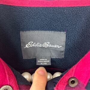 Good pre worn condition. Eddie Bauer size XL. Big plaid check pattern. Snap button down. Inner soft fleece material. Thicker shirt style, has a Shacket style to it. 100% cotton. Front pockets. All sales final.