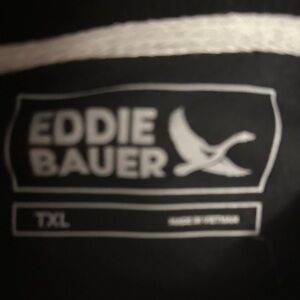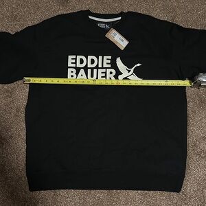 Classic black crewneck sweater. Features bold Eddie Bauer logo. Comfortable and stylish.