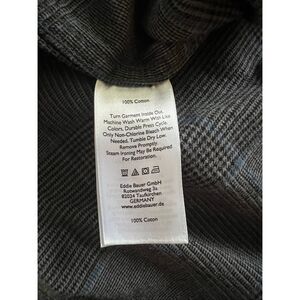 Long sleeve button down shirt from Eddie Bauer. Black, gray, and blue plaid print throughout. Breast pocket on upper left, button cuffs.