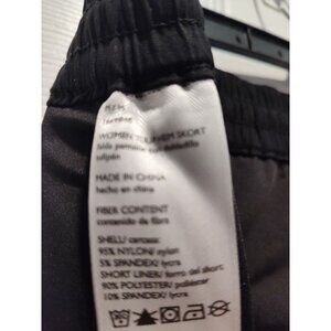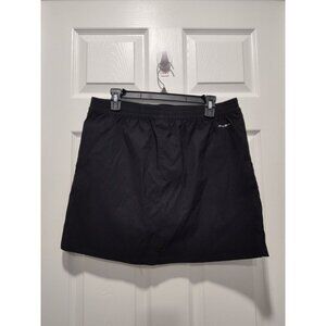 This Eddie Bauer black skort is the perfect addition to your golf wardrobe. The tulip hem and zipper accents add a touch of style, while the logo and elastic waistband make it comfortable and easy to wear. The skort is made of a lightweight microfiber material, which makes it perfect for warmer weather.