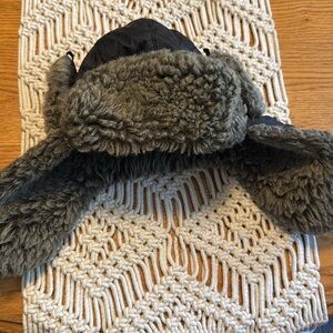 Warm and cozy hat with ear flaps by Eddie Bauer. Buckle closure that snaps together is missing so does not actually fasten under the chin.