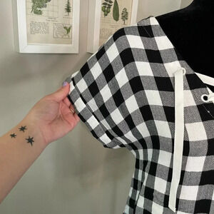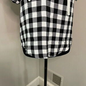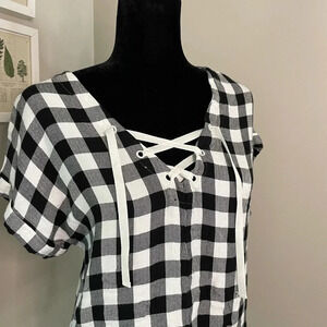 Eddie Bauer Black and White Buffalo Plaid Print Top with Lace Up Neckline
