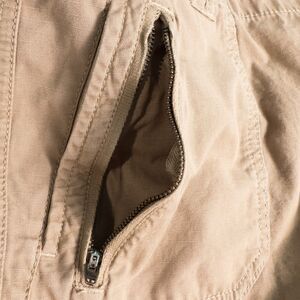 * 5 pockets: 2 front slash, 1 front zipper, 2 back flap snap button