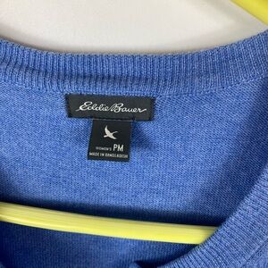 Cozy blue knit sweater. Ideal for casual wear and layering. Size Medium Petite but I think fits like a regular Medium. Short sleeve. Pet free and a smoke-free home.