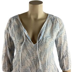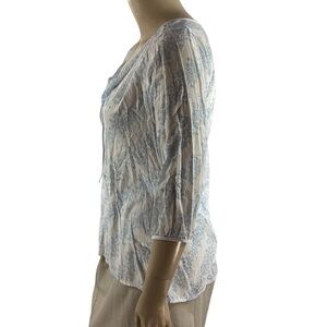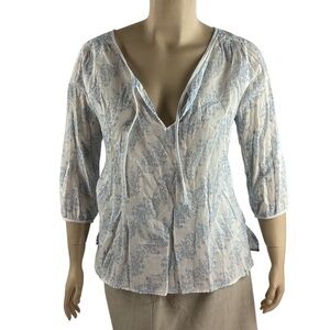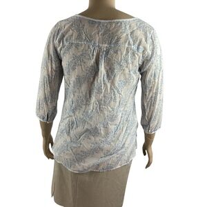 eddie bauer cotton blouse, blue white floral blouse, lightweight cotton top, v neck peasant shirt, semi sheer boho blouse, 3/4 sleeve floral shirt, spring cotton blouse, casual travel top, relaxed fit floral blouse
