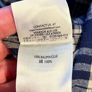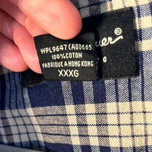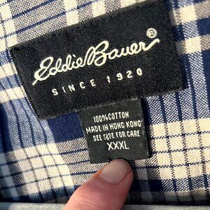 The product is a size XXXL Eddie Bauer Blue & White Plaid 100% Cotton Flannel Long-Sleeve Button-Up shirt. This shirt features a classic collared neckline with a button-down style, making it suitable for travel, casual wear, or work in the winter, fall, or spring seasons. The regular fit of the shirt is designed for big and tall men, and is machine washable for easy care. Made in Hong Kong, this button-up shirt is a versatile and comfortable addition to any wardrobe.