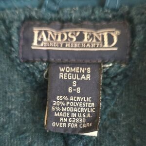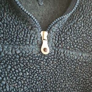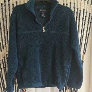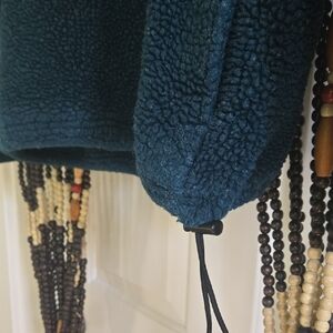Dark teal cozy half-zip pullover with cinchable waist and side pockets. In great preloved condition with normal signs of wear