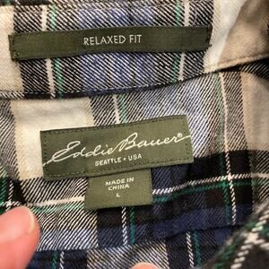 Eddie Bauer blue and white flannel shirt in relaxed fit, size large. This gently used shirt is in excellent condition and ready for a new home. Soft and comfortable, perfect for casual wear or layering during cooler weather. Grab this stylish and versatile flannel shirt today!