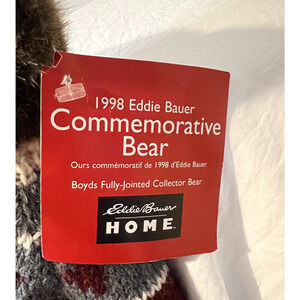 This is a vintage Eddie Bauer Boyd's Bear from 1998, part of the Eddie Bauer Commemorative Bear collection. The bear is fully jointed, handmade with beans and plush material, and measures 11 inches in height and 8 inches width. It features a brown color and comes with its original tags. This collector bear is a single unit and is in new old stock condition.
