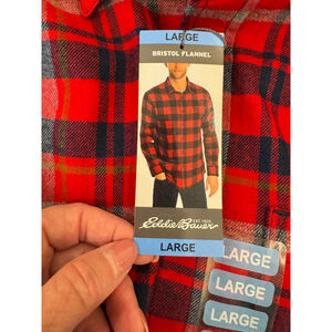 This is a new with tags Eddie Bauer Bristol Flannel shirt, size Large. The shirt features a red, navy, and gray plaid pattern. It has a button-down front, long sleeves with buttoned cuffs, and a chest pocket on the left side. The material is a soft, double-brushed cotton flannel. The shirt measures approximately 30 inches in length and 24 inches in width. There are no visible imperfections.