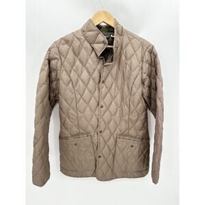 Brown goose down button down quilted jacket. Long sleeves, button front closure, pockets.