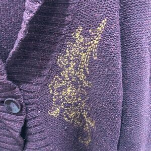 Mottled maroon cotton knit with yellow embroidered flower on left side (close-up photos look more purple but the sweater is definitely closer to a dark red/maroon.