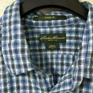 Eddie Bauer Blue Button Down Plaid 100% Cotton Front Pocket Classic Fit