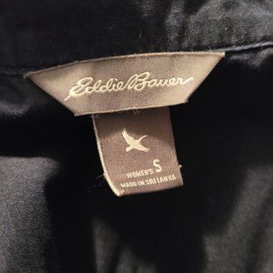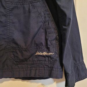 Eddie Bauer button down jacket. Navy blue. 2 front button pockets on the chest and 2 front side pockets. Adjustable waist, ties inside.