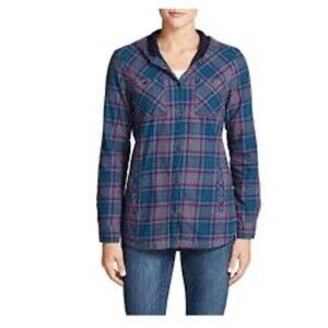 Eddie Bauer hooded flannel shirt, featuring a blue, pink, and black plaid pattern. The shirt has long sleeves, button-down closure, two chest pockets with button flaps, and a hood. The hood lining is a solid dark blue color.