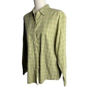 Eddie Bauer Button Up Long Sleeve Shirt L Green Cream Plaid Point Collar Cotton