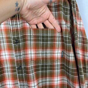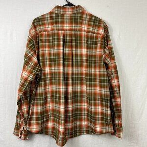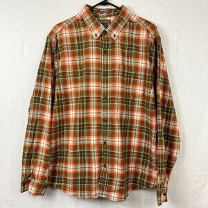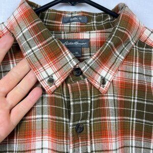 Eddie Bauer classic fit long sleeve button up plaid flannel shirt in orange and brown