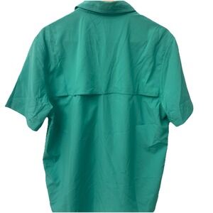 The Eddie Bauer Button Up Shirt in size small is a lightweight and breathable option for summer, fall, or spring. It features a collared neckline, short sleeves, and a vented zip pocket for convenience. The shirt is made of polyester fabric and has a solid green color, making it versatile for casual, travel, or workwear occasions. With its classic outdoor theme and Eddie Bauer brand, this shirt is perfect for a day out fishing or simply enjoying a leisurely summer day.