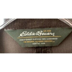 Stay stylish and comfortable with this Eddie Bauer button-down corduroy jacket/coat in brown. The mid-length coat features a solid pattern with long sleeves and button closure. It has a regular fit and is available in size large. Jacket is in excellent Preowned condition with no flaws.