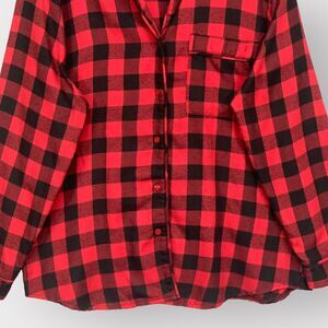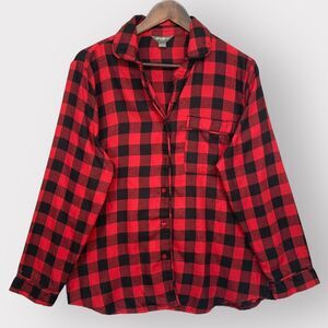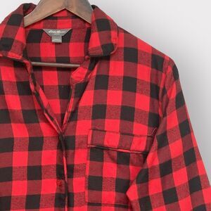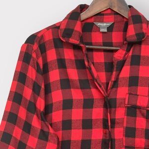 Eddie Bauer Button-Up Shirt Women L Red Plaid Curved Hem Flannel Pocket Collared Long Sleeve
