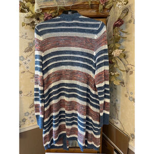 Pre-owned Eddie Bauer women's size XL cardigan. The horizontally striped cardigan is made of 100% cotton in shades of blue, white, and rust. It features an open front, long sleeves, and two pockets. It's lightweight and soft. The approximate dimensions are 21" inches across the chest and 33" inches in length. The cardigan is in beautiful condition, no flaws, smoke free environment.