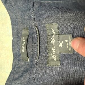 Classic fit blue chambray short sleeve buttoned on shirt by Eddie Bauer.