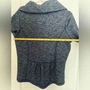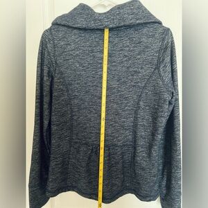Cozy charcoal blue cardigan with cowl neck and top snap closure (open at bottom) .