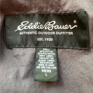 Classic EDDIE BAUER Army Green Utility Field Jacket. Stowable hood, cargo pockets, full zip and snap front, interior drawstring at waist, lined. Cotton and polyester blend.