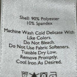 Machine wash cold, delicate, with like colors. Do not use fabric softeners. Tumble dry low. Remove promptly.