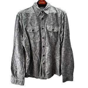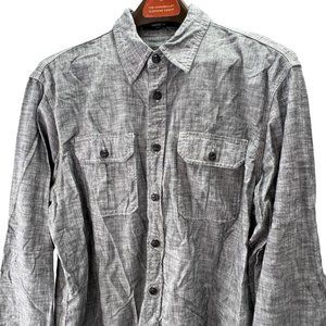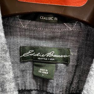 Eddie Bauer button front shirt in gray/black chambray. Classic Fit style, good condition. Size L.
