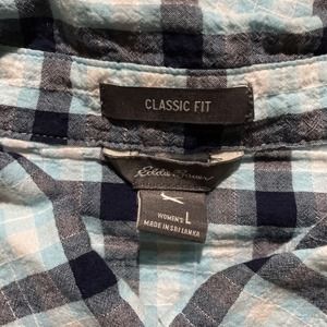 Eddie Bauer Classic Fit Shirt Blue Teal Button Up Plaid Pocket Outdoors Large.
