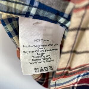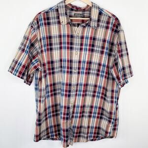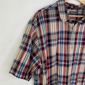 Classic fit tan, blue, red, white, and black plaid button down shirt. Short sleeves, collared neckline, button front. 100% cotton.