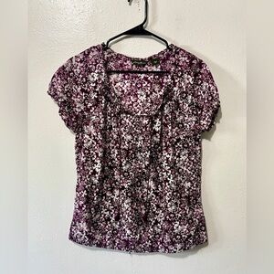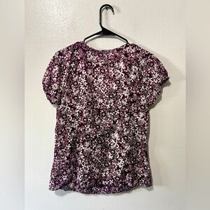 Eddie Bauer branded peasant style blouse with in a white and purple floral pattern, short sleeves, elastic ruffle detail on cuffs, tassel details on v-neckline, 100% cotton fabrication, lightweight and breathable.