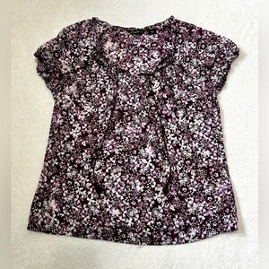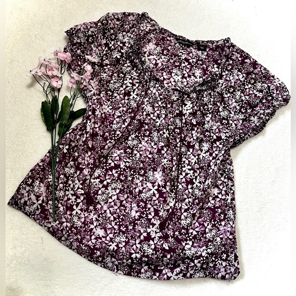 Eddie Bauer branded peasant style blouse with in a white and purple floral pattern, short sleeves, elastic ruffle detail on cuffs, tassel details on v-neckline, 100% cotton fabrication, lightweight and breathable.