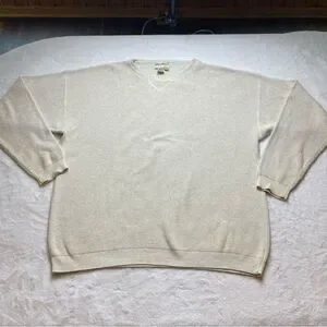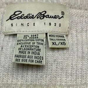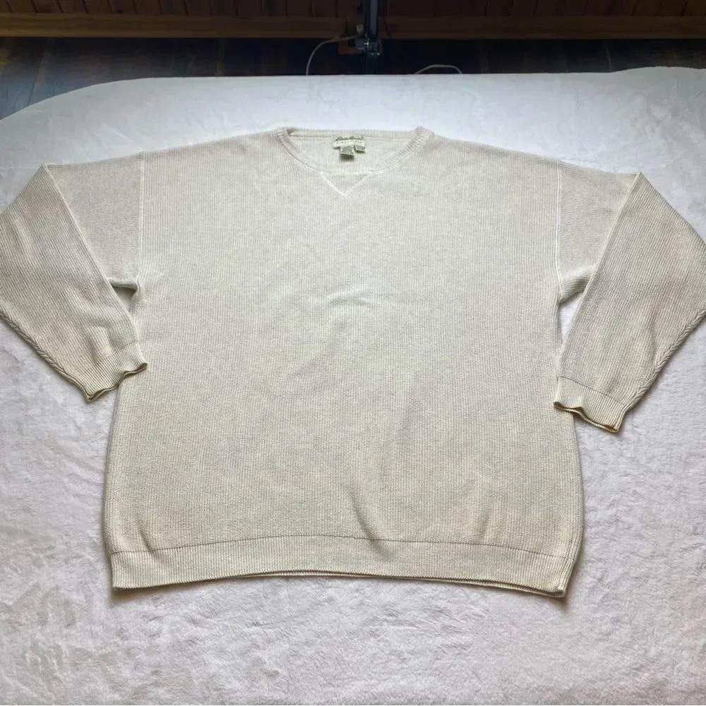 Eddie Bauer Cream Long Sleeve Crew Neck 100% Cotton Sweater Size XL. Great used condition. Pullover cotton sweater. Drop shoulders Very slight discoloration at sleeve cuff edge. Otherwise no flaws. Measures chest 51", length 29.5", sleeve 24.5".