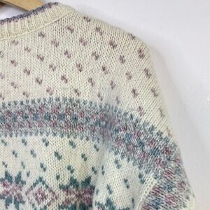 Cozy crew neck sweater with intricate patterns. Soft and stylish. Perfect for layering.