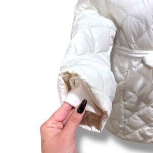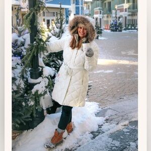 Eddie Bauer Cream Quilted Goose Down Hooded Faux Fur Belted Jacket Size Large