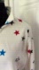 Eddie Bauer Cozy Cream Fleece Pullover with Red, Blue, and Black Star Pattern. Size large.
