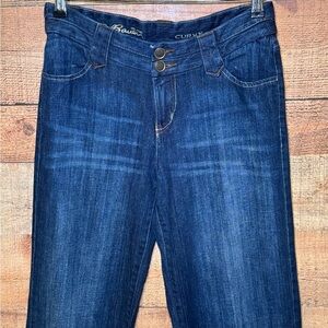 Eddie Bauer Curvy jeans in a women's size 4. Great used condition. Dark denim in color with factory whiskering and distressed fading at the thigh and backside area. Bootcut style