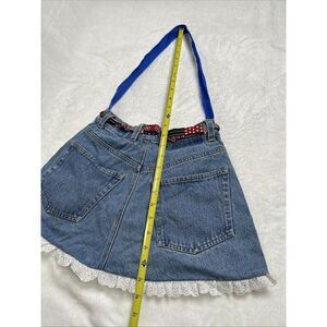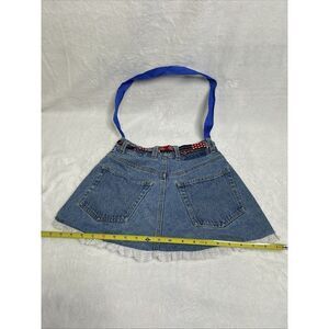denim skirt bag, mini, blue, patchwork, heart-shaped, USA flag, ruffled hem, playful, casual, vintage-inspired, summer, patriotic, fun, quirky, trendy, feminine, retro, comfortable, youthful, laid-back, handcrafted