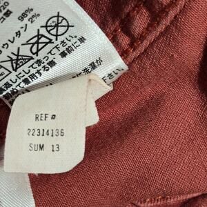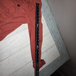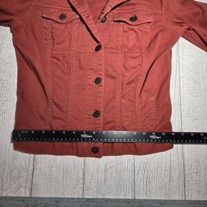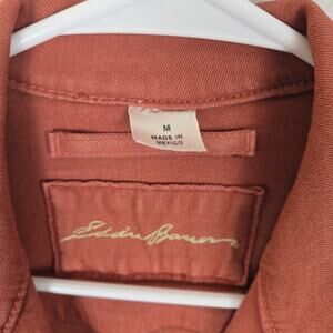 This Eddie Bauer denim jacket in size medium features a retro 80s rock-inspired design perfect for bikers and grunge enthusiasts. The red solid color, long sleeves, and button closure give it a classic yet edgy look. With accents like logos and a collared neckline, this mid-length jacket is lightweight and stylish, making it a versatile addition to any wardrobe. Perfect for outdoor activities or casual wear, this jacket combines a touch of vintage flair with contemporary style.