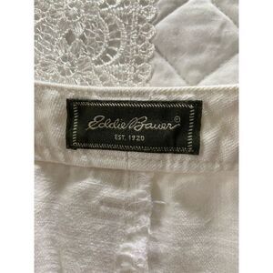 This Eddie Bauer skirt is a size 6, straight and pencil style, with slits front and back. It is knee-length and comes in off white denim. It has a button fly and pockets. Suitable for casual occasions and all seasons, it is machine washable for easy care. The skirt is pre-owned but in excellent condition with no flaws.