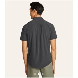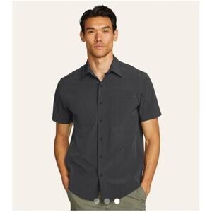 "The Eddie Bauer Departure Shirt in Men's Medium, Carbon is a short-sleeved shirt designed for travel, hiking, and casual wear.