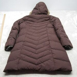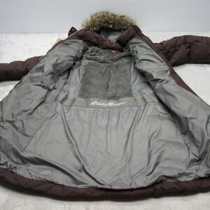 Keywords: Eddie Bauer, down coat, puffer coat, winter coat, parka, faux fur hood, long coat, brown coat, insulated coat, winter jacket, womens coat, outdoor coat, warm coat, quilted coat